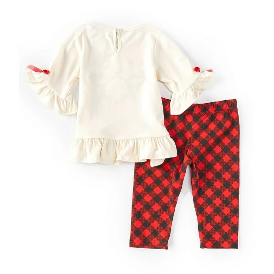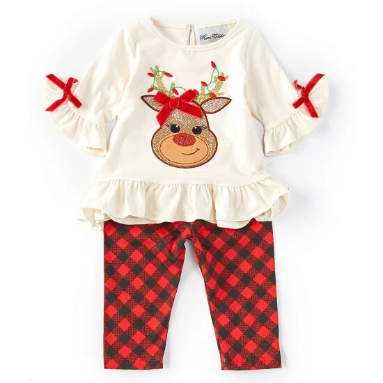 - solid tunic top with round neckline, tiny bow accents on the bell sleeves, Christmas red-nosed reindeer face appliquรจ on the front and a ruffled hem