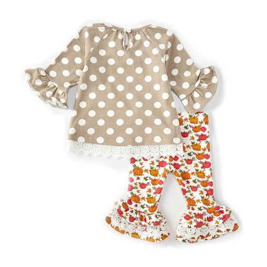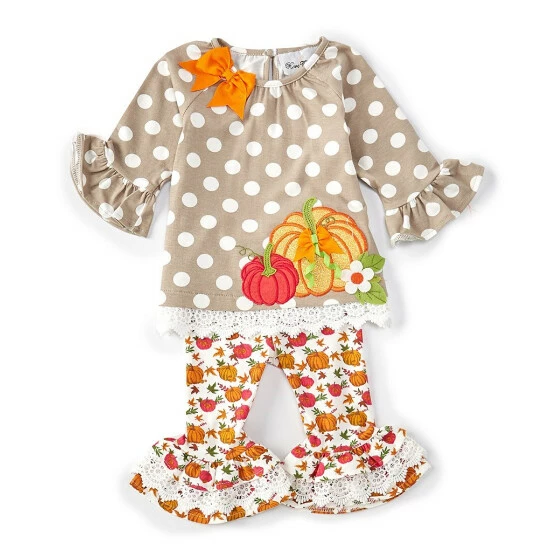 - Large-dot print top with round neckline and ruffled cuffs on the 3/4 raglan sleeves plus a Thanksgiving pumpkin design along the front hem and pullover styling