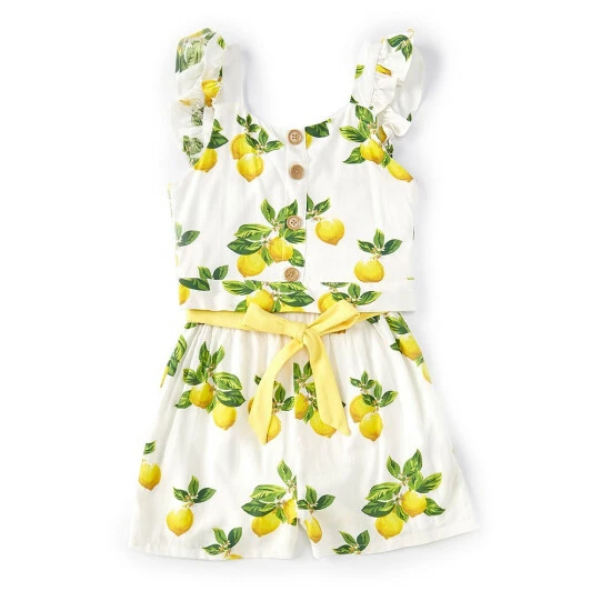 - Lemon print top with round neckline, flutter cap sleeves, cropped hem and pull-over style