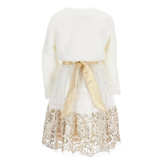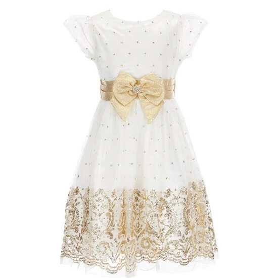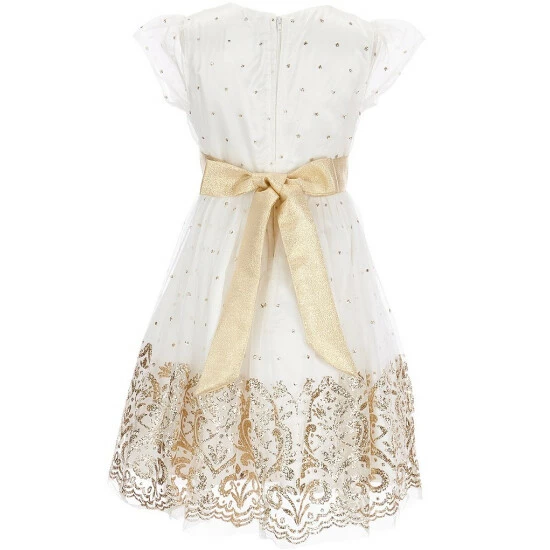 - metallic bow detail at waistline, zip back closure pattern glitter border includes lining and panty