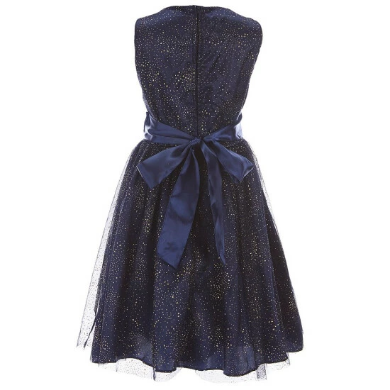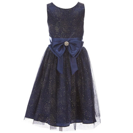 - printed social dress with round neckline and flutter cap sleeves plus embellished bow trim at the waist and a full, pleated skirt