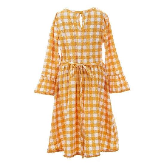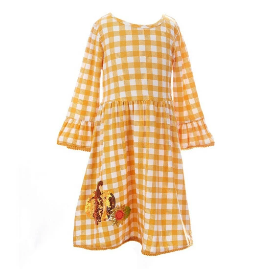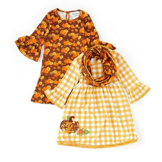 - One checked dress with round neckline, ruffled cuffs on the long sleeves, a pleated skirt with pumpkin and flower appliquรจ at the hem, includes a coordinating scarf