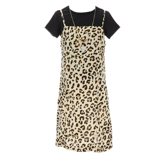 - cheetah print dress with square neckline, sleeveless styling, lining, and pull on construction