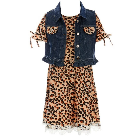 - animal-printed French terry A-line dress with round neckline, ruffled cuffs and bow trim on the short sleeves and full skirt, 28#double; length