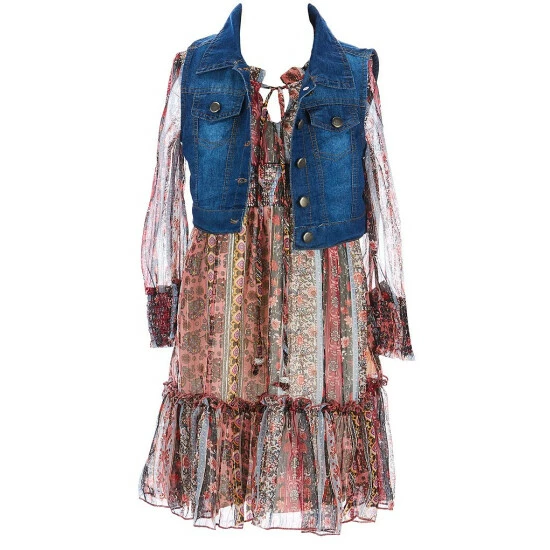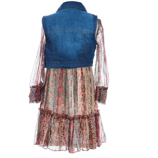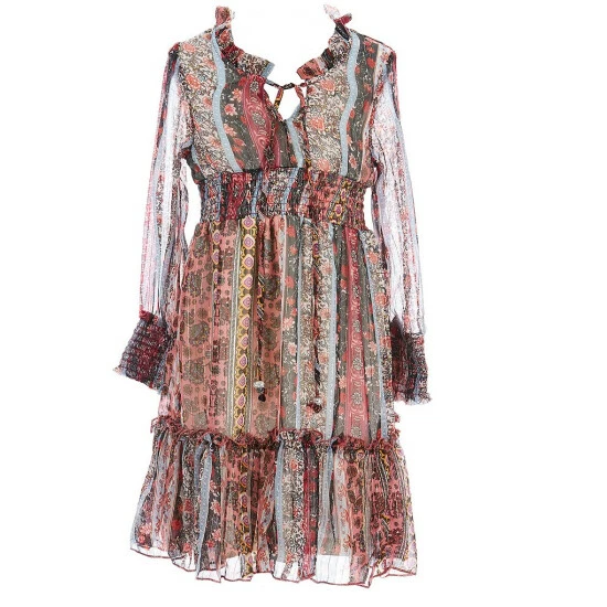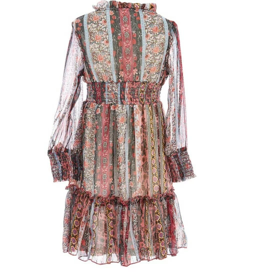 - Mixed-media printed dress with long sleeves, smocked waist and tiered skirt