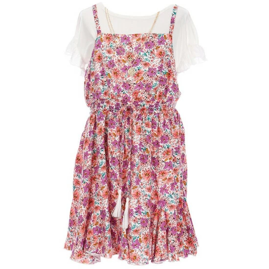 - floral challis fabrication jumper with square neckline, sleeveless, tie detail at waistline and pull-on styling