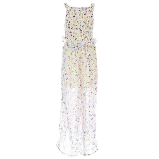 - Smocked tank top with square neckline with scallop detail, sleeveless styling and ruffled hem