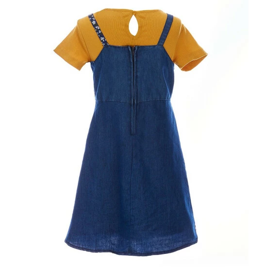 - patchwork denim jumper dress, square neckline, sleeveless styling plus shoulder straps and full skirt, 24#double; length