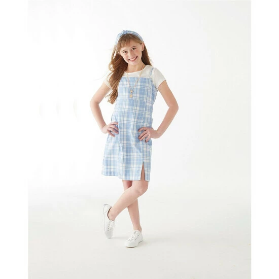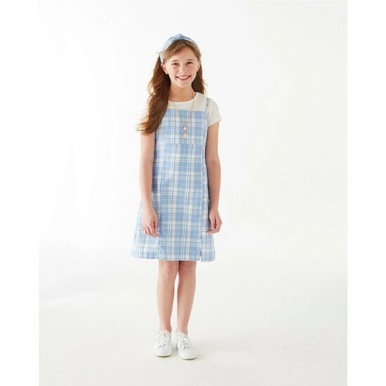 - plaid fabrication jumper dress with square neckline, sleeveless styling, adjustable spaghetti strap and side seam pockets on skirtย