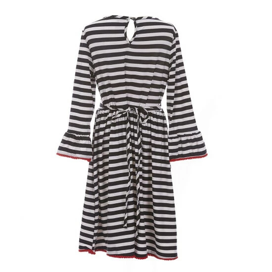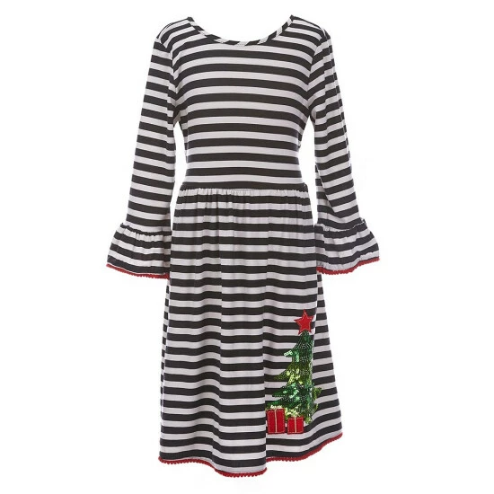 - one striped shift dress with round neckline, bell sleeves, a Christmas tree appliquรจ at the hem, lettuce edging and pullover styling
