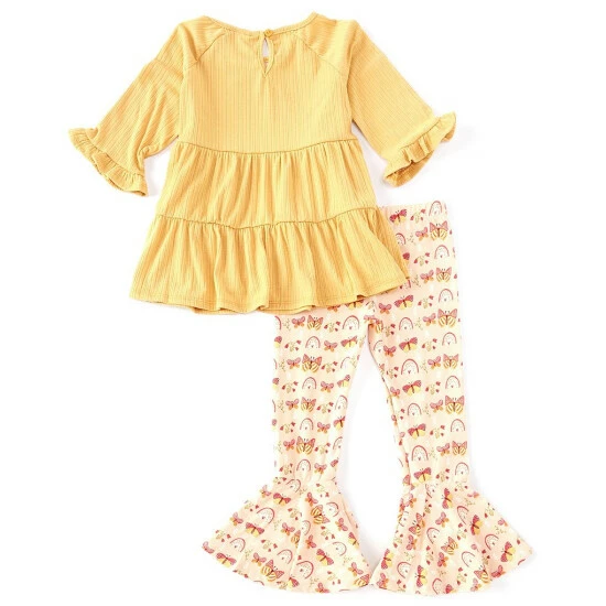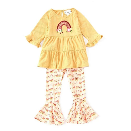 - rib-knit tunic top, round neckline, ruffled 3/4 sleeves, rainbow appliqué on the front and a tiered hem