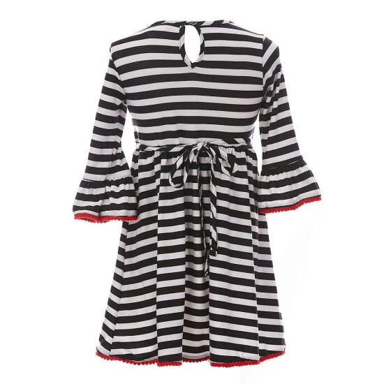 - one striped shift dress with round neckline, bell sleeves, a Christmas tree appliquรจ at the hem, lettuce edging and pullover styling