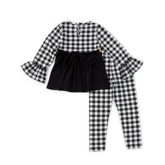 - color block dress, round neckline, checked bodice with ruffled cuffs on the long sleeves, dotted pull-through ribbon and bow trim at the waist, solid skirt with pumpkin appliquΓ©s above the hem