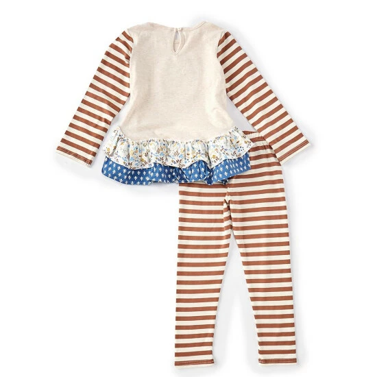 - heathered knit tunic top, round neckline, striped long sleeves, solid body with an owl appliquรฉ on the chest and a mixed-media ruffled hem