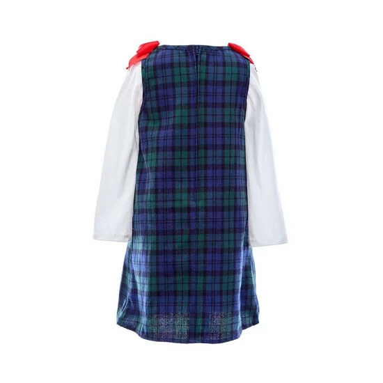 - plaid twill jumper dress with round neckline, sleeveless styling, plus bow accents on both shoulders, Santa Claus #double;riding#double; in a sleigh with #double;flying#double; reindeer on the front, and pullover style; Approx. 16#double; length
