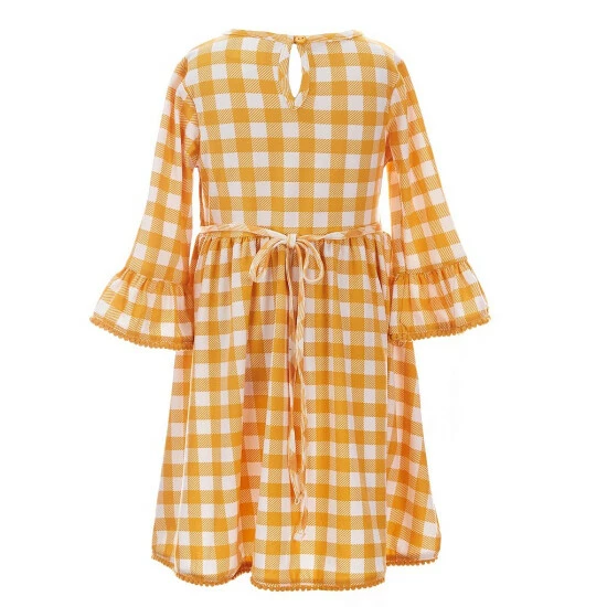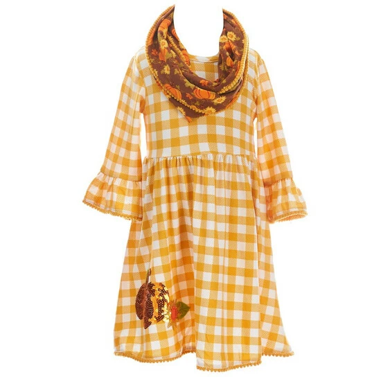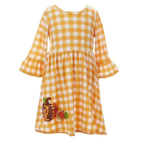 - Checked print dress with a round neckline, long sleeves with ruffled cuffs, a pleated skirt with pumpkin and flower appliquè at the hem
