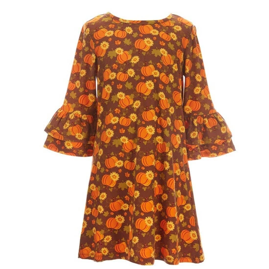 - Pumpkin-printed dress with round neckline, double-ruffle detail on the sleeves and a shift silhouette