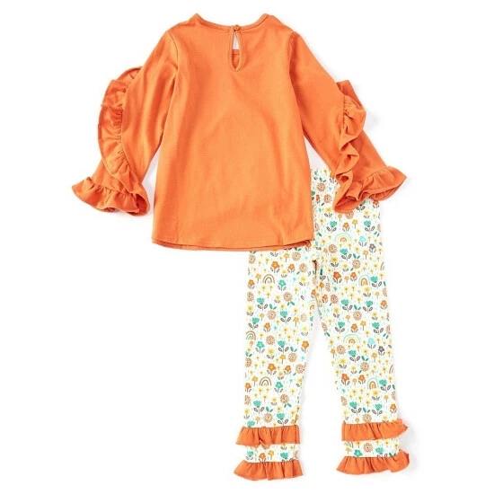 - solid top with round neckline, ruffled long sleeves plus a giraffe appliquรฉ on the front and keyhole back neck