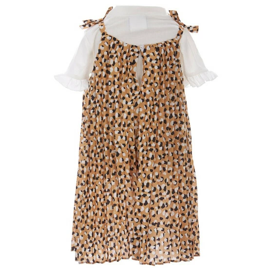 - animal-printed jumper dress with round neckline and sleeveless styling plus bow tie-accented shoulder straps, a pleated body and pullover styling’