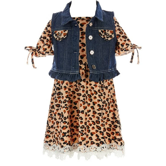 - animal-printed French terry A-line dress with round neckline, ruffled cuffs and bow trim on the short sleeves and full skirt