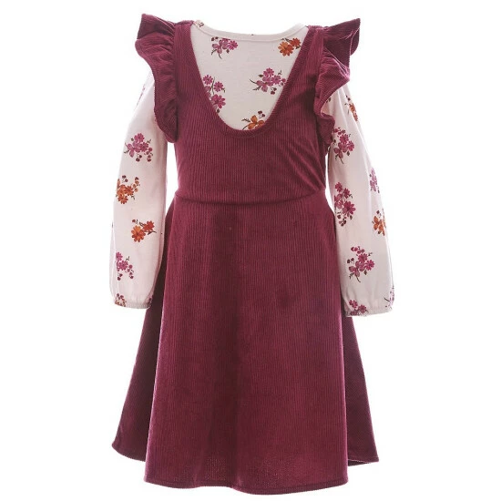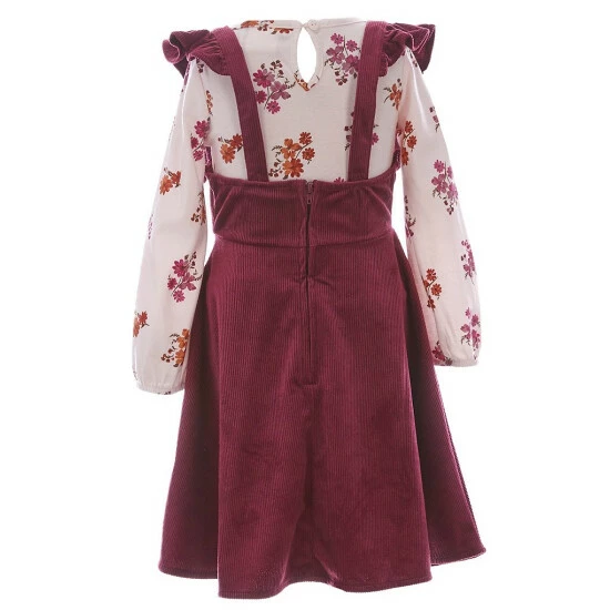- solid corduroy jumper dress with V-neckline, ruffled shoulder straps, full pleated skirt and zippered back (22.5#double; length)
