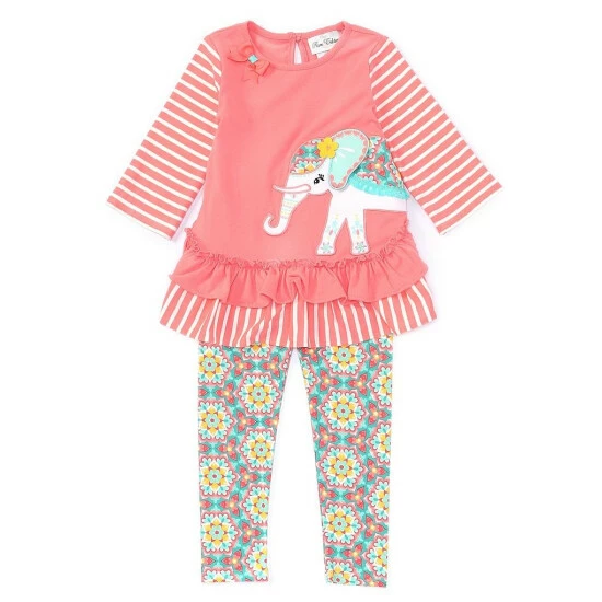 - Round neckline, 3/4 sleeve, striped pattern, elephant applique on front, two tier ruffle, bow detail on neckline, back button keyhole closure