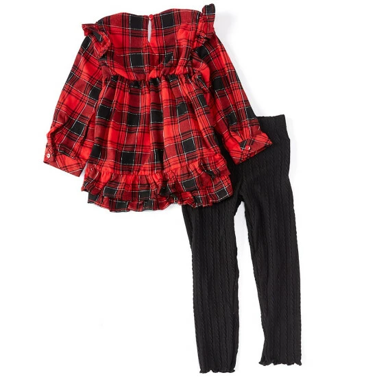 - Yarn dye lurex plaid top with round neckline, long ruffle sleeve
