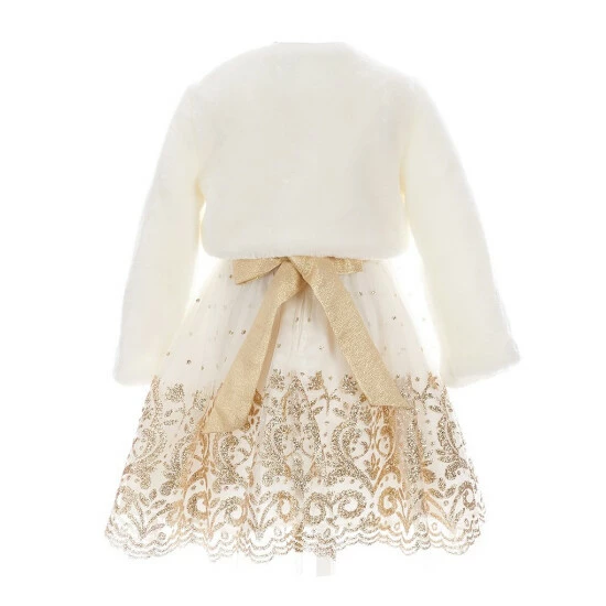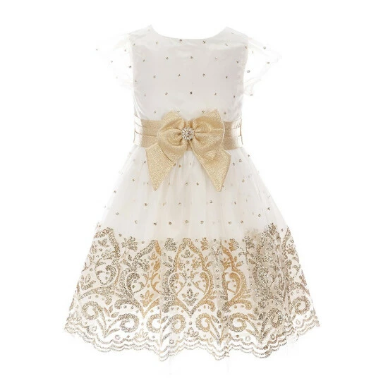 - glitter-accented pindot mesh dress with round neckline, wide satin ribbon, jewel-accented trim at the waist and a patterned border hem