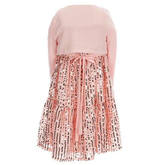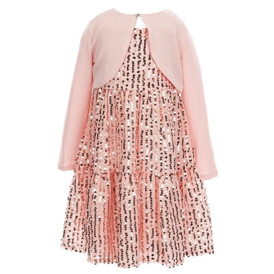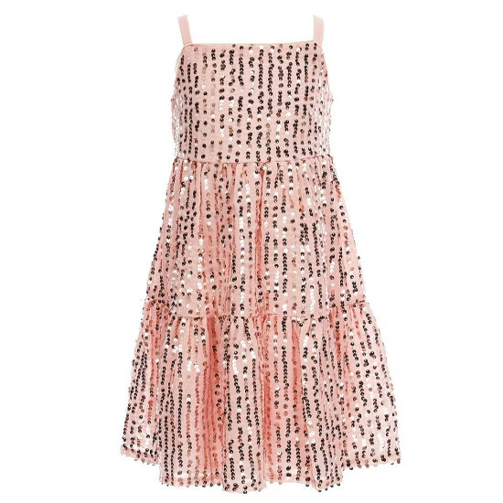 - Sequin-embellished fabric dress, sleeveless, tank straps, elastic waist, sip back closure, tiered skirt, knee length